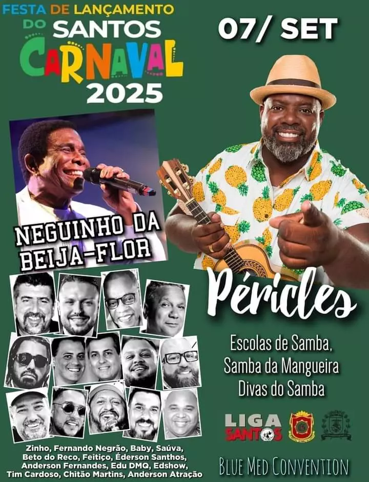 Péricles e Neguinho da Beija-Flor serão as atrações principais do evento, que também terá a apresentação das escolas de samba e de grandes nomes do samba santista.