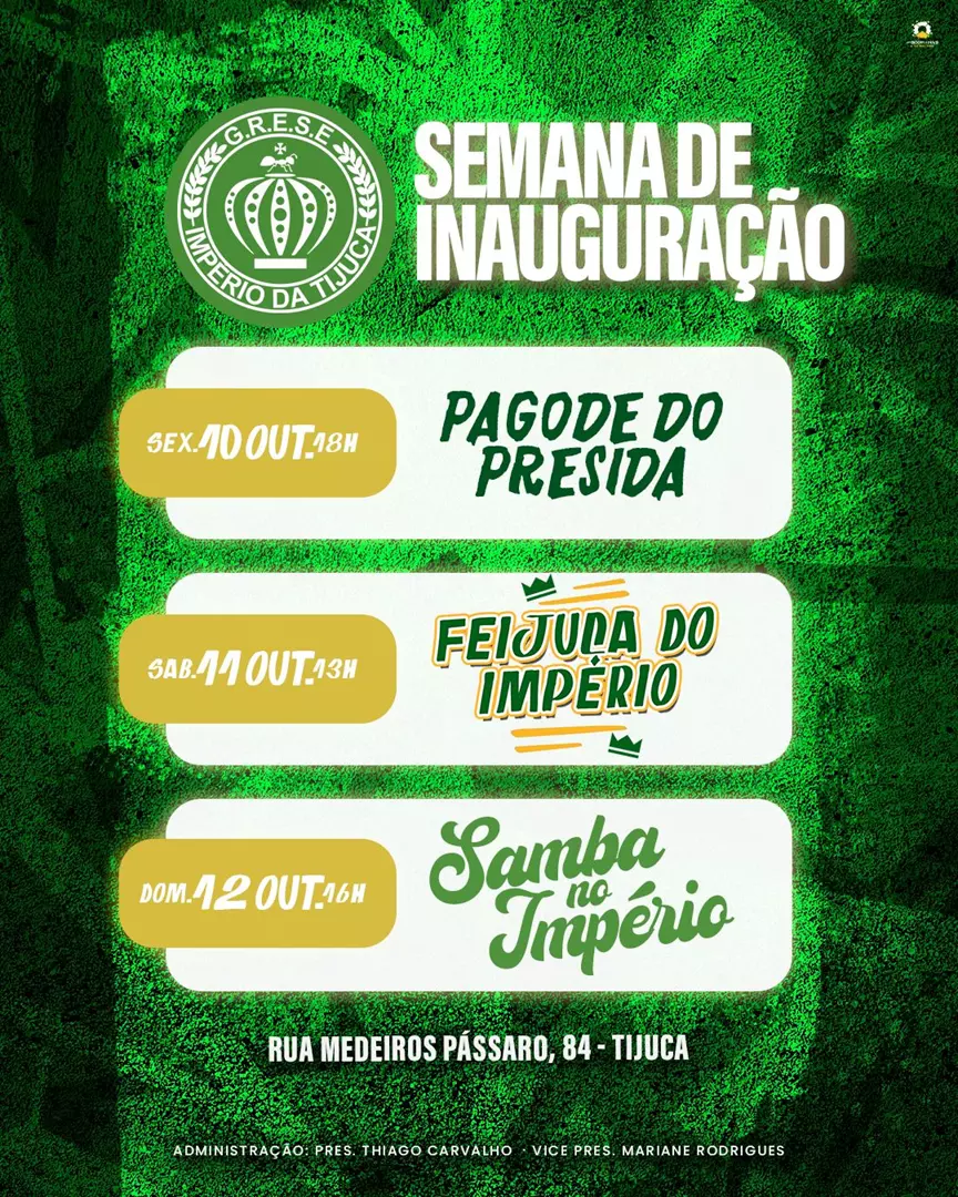 ?? 12/10 – Samba do Império - Encerrando o fim de semana, este evento acontecerá a apresentação oficial de toda a equipe que comandará o Carnaval 2026. Será o start da escola rumo ao título da Série Prata.