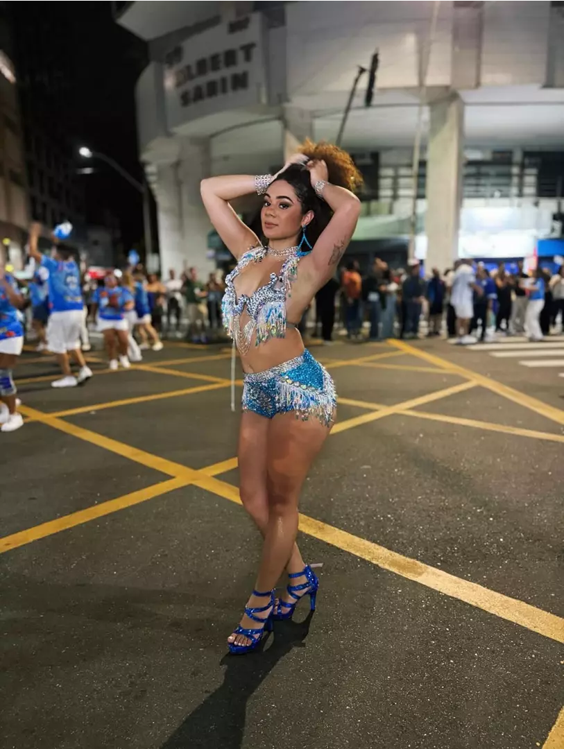 Para a ocasião, Karinne escolheu um short e um top personalizados nas cores da escola, exaltando a identidade da agremiação. Estudante de Odontologia da UFRJ, Karinne concilia a rotina acadêmica com a arte do samba, mantendo-se presente nos eventos e representando com orgulho a escola.