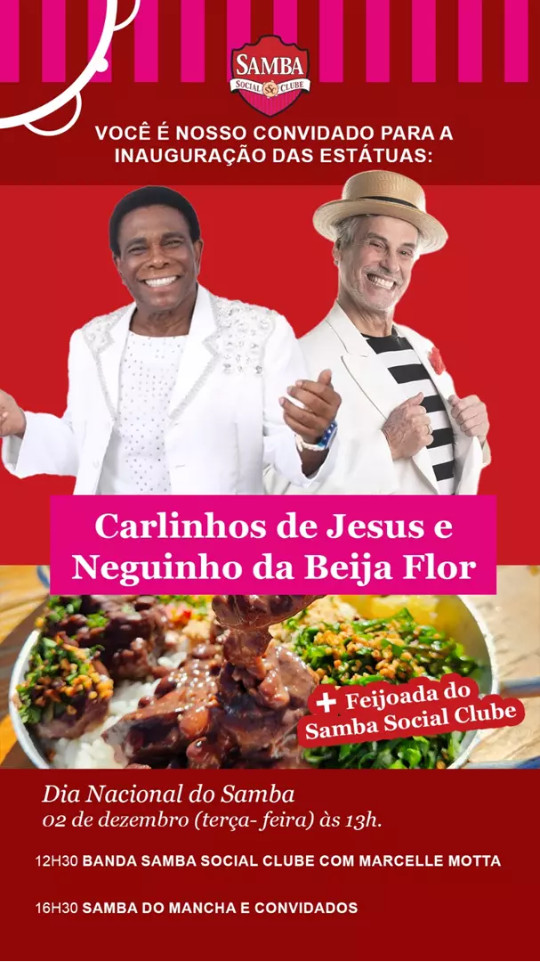 A inauguração das estátuas será marcada por uma grande celebração no quiosque, com feijoada servida a partir das 13h, e contará com a presença dos grandes homenageados. E a partir das 12h30 a banda Samba Social Clube com Marcelle Motta se apresenta e às 16h30 o público vai curtir o Samba do Mancha com a presença de convidados.