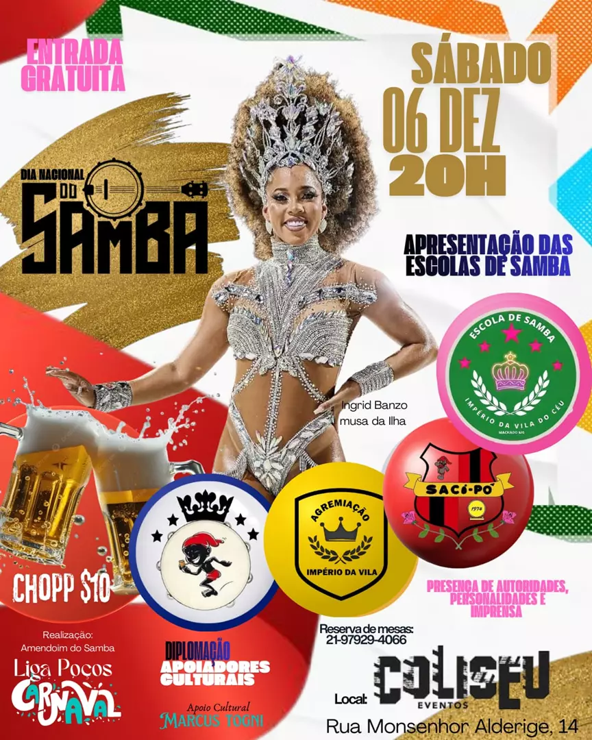 ESCOLAS DE SAMBA DE POÇOS DE CALDAS - MG, CELEBRAM O “DIA NACIONAL DO SAMBA” NO COLISEU EVENTOS NESTE SÁBADO, 06 DE DEZEMBRO