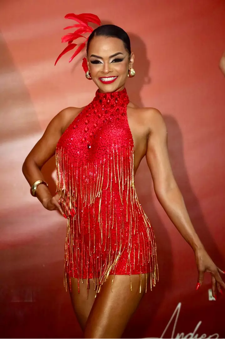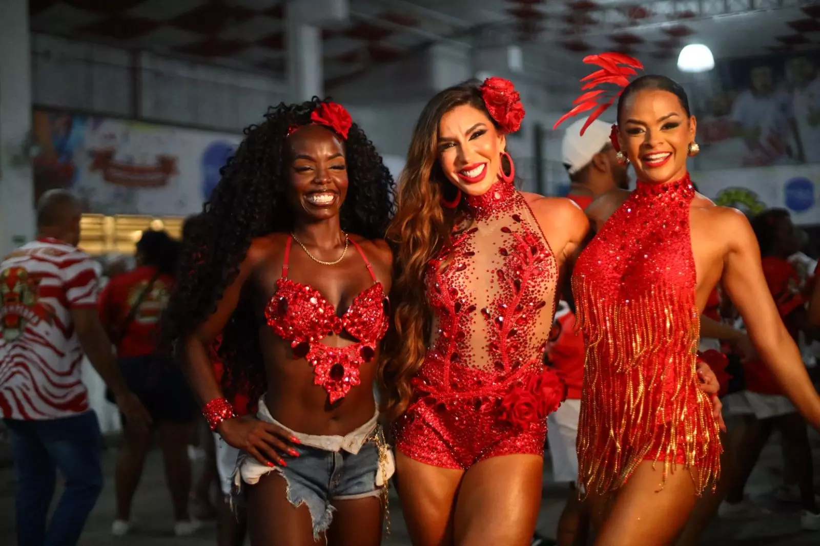 Logo ao chegar, a musa chamou a atenção pelo figurino marcante: um macaquinho vermelho com franjas, que valorizou ainda mais a silhueta da beldade e trouxe elegância, atitude e identidade à noite de ensaio. O look rendeu elogios e não passou despercebido pelos componentes e pelo público presente.